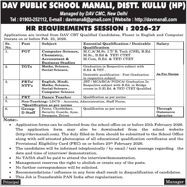 DAV Public School Manali started its humble journey in 1982 with a meager strength of 36 students. At present the school is affiliated to CISCE & H.P. Board of School Education over the years, the school has evolved as an epitome of knowledge, skills, tradition, manners.